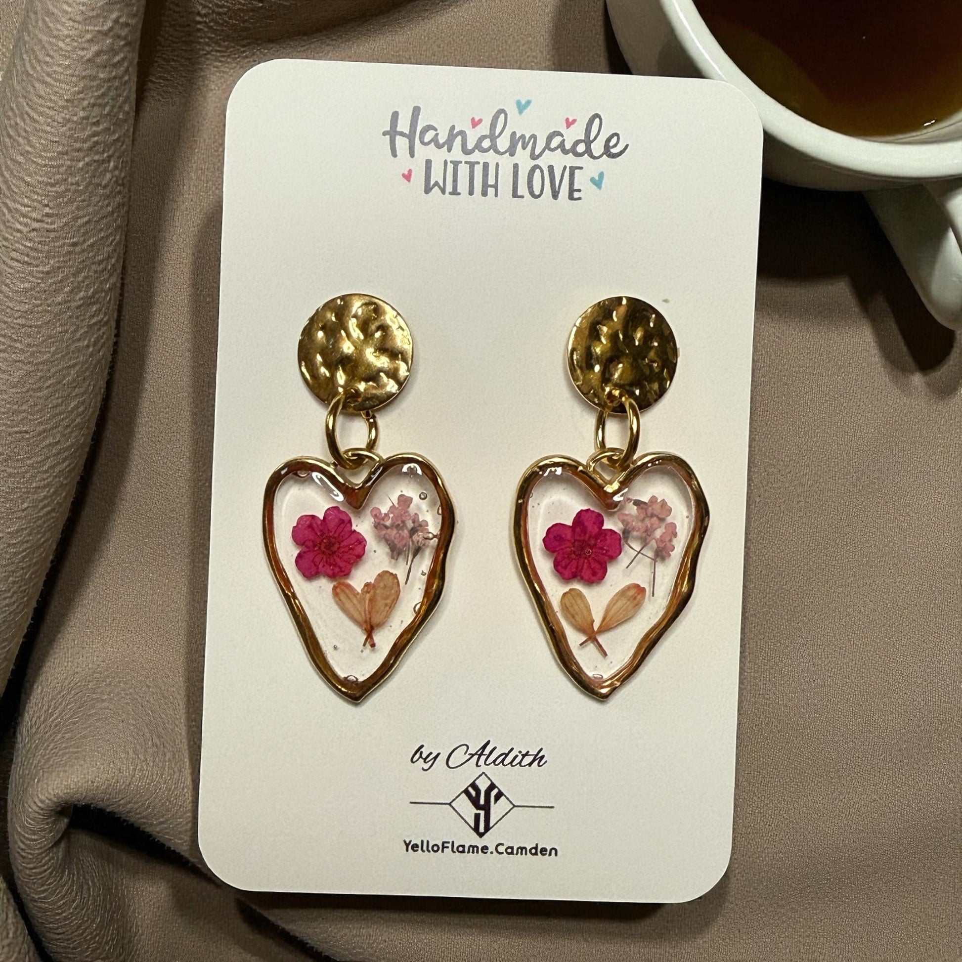 Handcrafted with love, these Pressed Flower Heart Earrings capture nature’s beauty in every detail. Each piece is delicately made with real dried flowers, preserved in crystal-clear resin and framed in a luxe gold-tone heart.